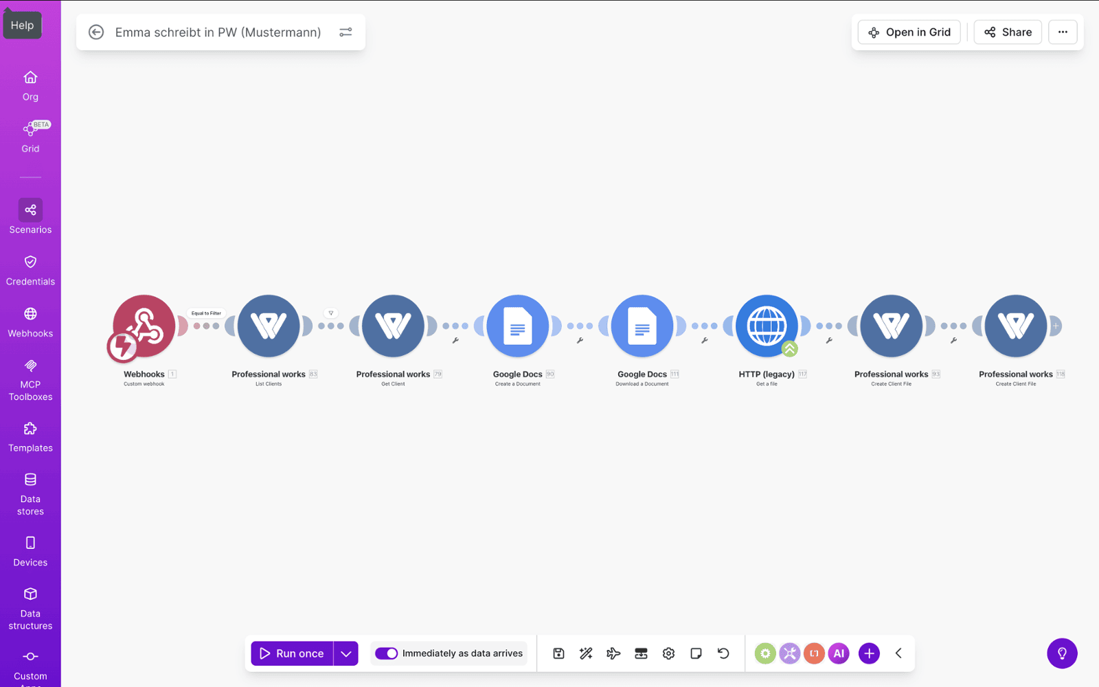Das vollständige Gesprächsprotokoll wird als PDF erzeugt und gemeinsam mit der Original-Audiodatei direkt beim jeweiligen Kontakt im Professional Works hinterlegt.